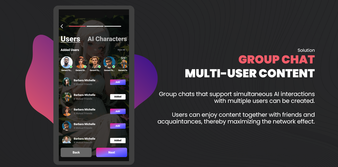 Group Chat : 1:1 AI Chat에서 발전된 형태로, 여러 AI와 대화를 하거나 하나의 AI와 여러 명의 유저가 동시에 대화를 할 수 있는 방식입니다. 다양한 개체가 참여하는 만큼 더 풍부한 콘텐츠가 생성될 수 있습니다.
