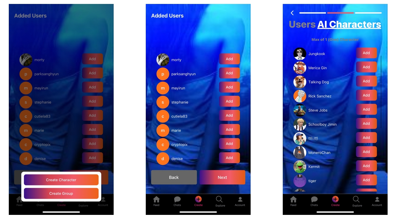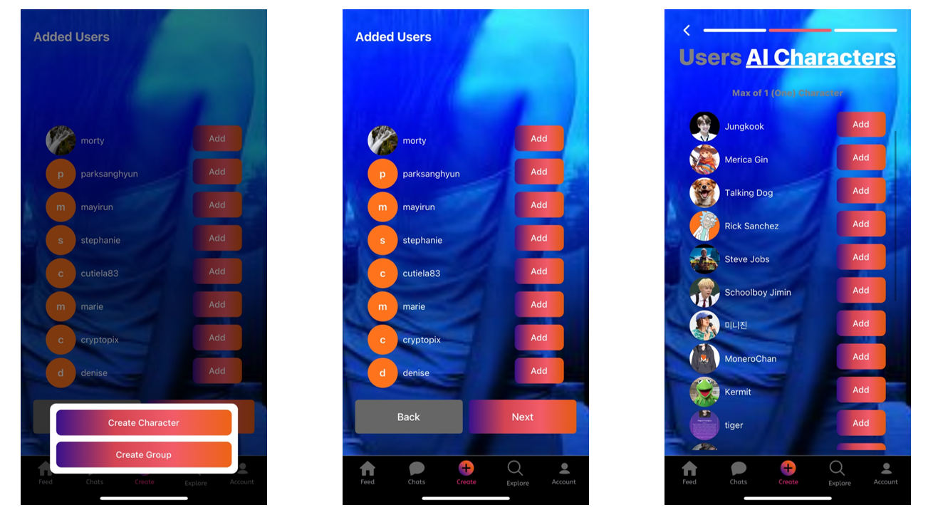 그룹을 생성하여 다른 유저와 AI 캐릭터를 각각 초대하여 같은 그룹 내에서 AI 채팅을 진행할 수 있습니다.