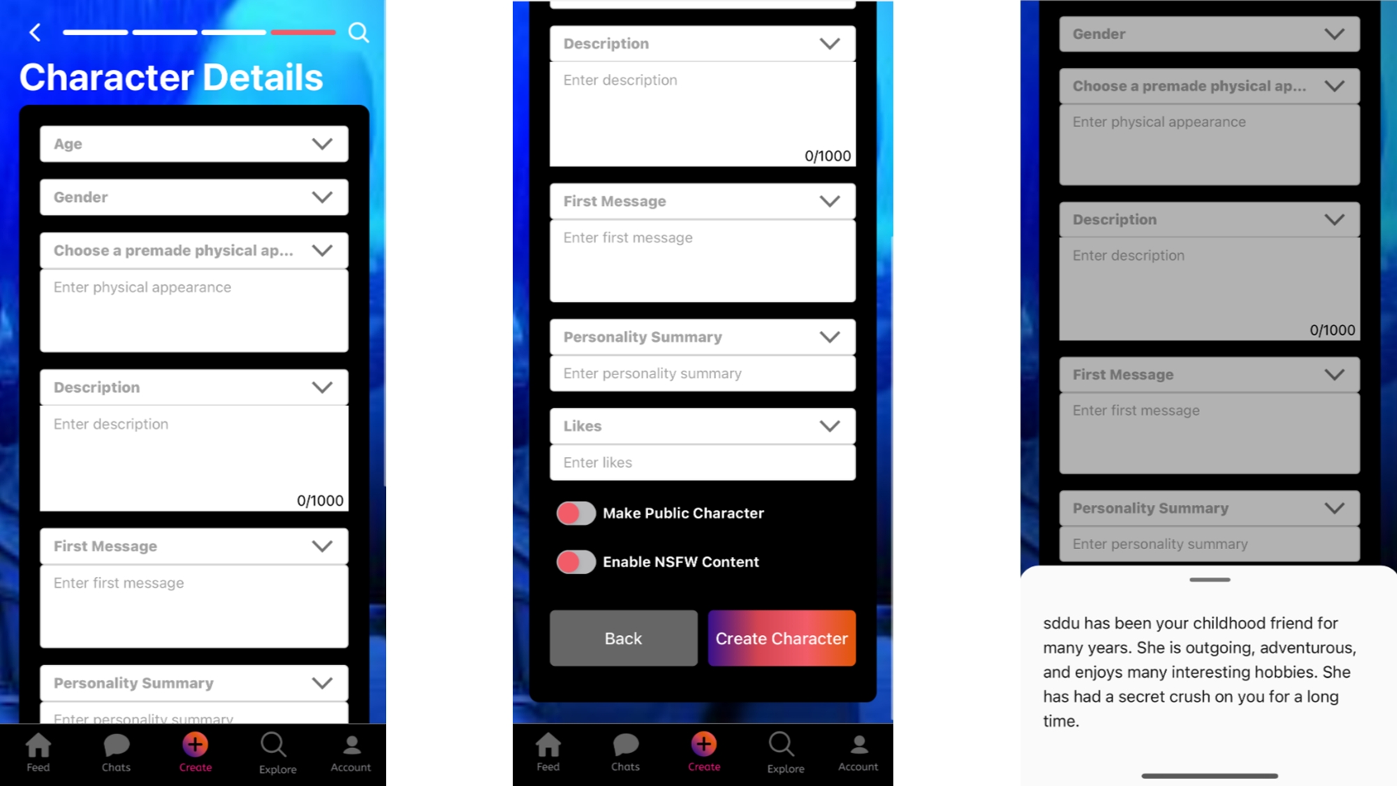 세부 정보를 입력할 때, 예시 문장을 사용하여 빠르게 캐릭터를 생성할 수 있으며, 각각의 항목을 텍스트로 직접 입력하여 보다 상세한 캐릭터를 만들 수 있습니다.